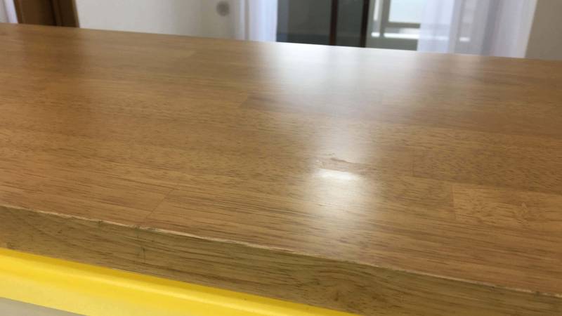 【補修前の状況】キッチンカウンターの木口を切断して無塗装の状態になっている【場所】キッチン【材料】集成材【色】木材色