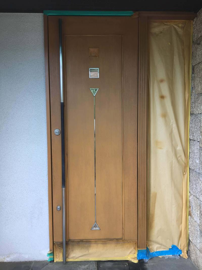 【作業の概要】表面の突板が劣化し色褪せてしまった木製玄関ドアの補修を行いました。劣化した部分を丁寧に剥がし、パテで補修した後にオーク色で塗装。クリア塗装とコンパウンドでの磨きで、美しく自然な仕上がりになりました。